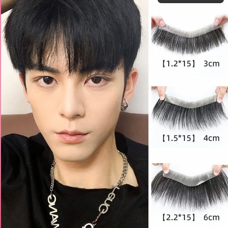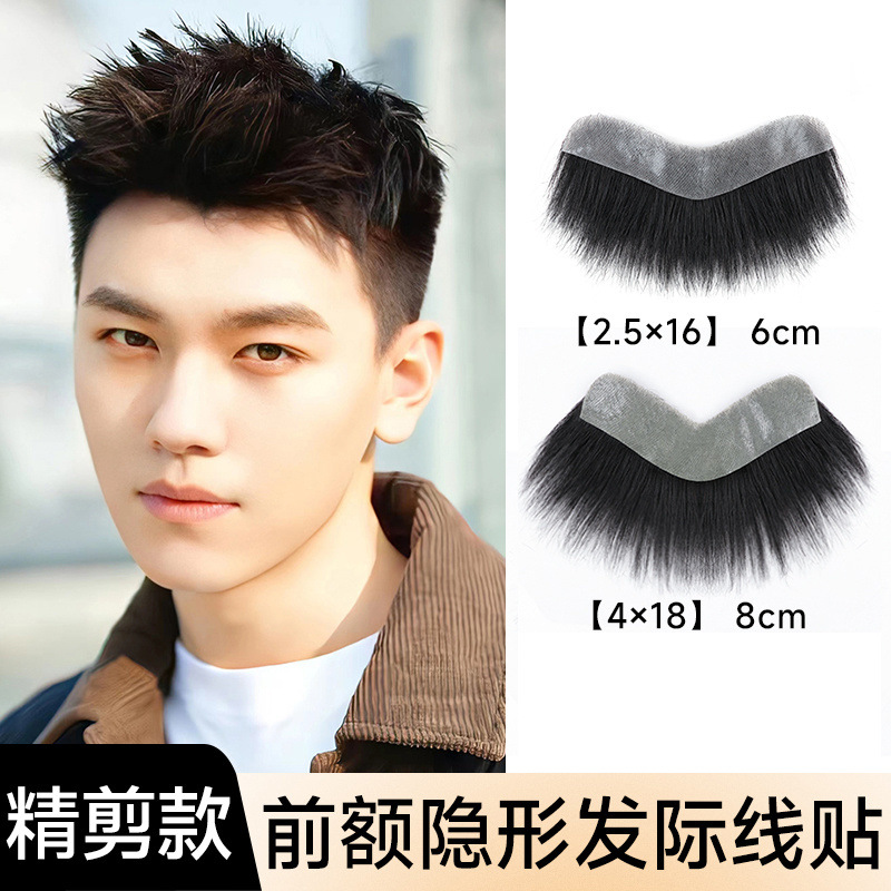 男性用ヘアラインウィッグステッカー、目に見えないシームレスな額ヘアライン偽前髪、バイオスカルプリアルヘアM型ウィッグピース