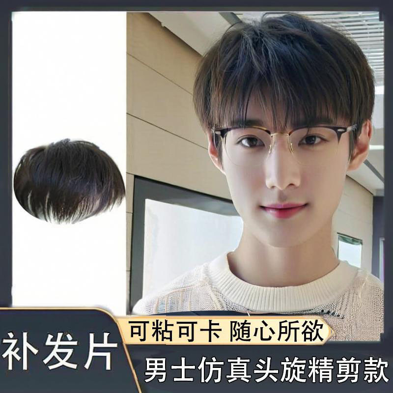 ショートヘアの男性用ウィッグ、ハンサムな韓国風ヘアピース、額に見えないシームレスな男性用フルリアルヘアヘッドトップヘアピース