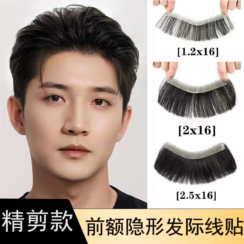 ヘアラインワンピースメンズインビジブルシームレス額ヘアライン偽前髪額頭皮本物の髪M型ウィッグピース