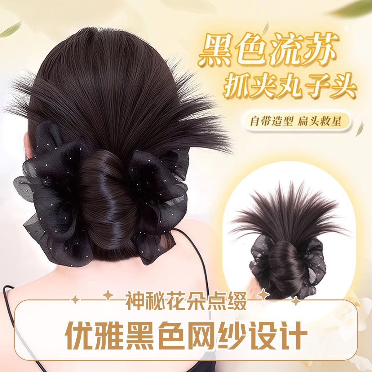 女性用ローカットボールヘッドウィッグ、本物のヘアゴム、漢服、古代風ヘアバッグ、怠け者のヘアアーティファクト、巻き毛、ふわふわ