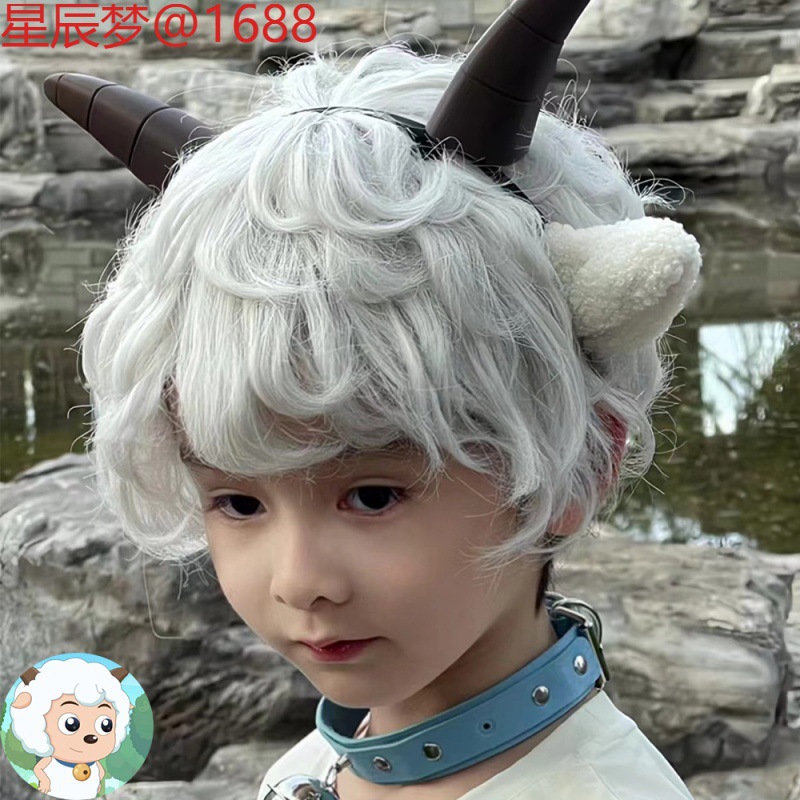 子供用ウィッグ cos 喜羊羊純白ショートカーリーヘア子供の楽しいホリデー白髪コントロールスタイリング男の子フルヘッドギア
