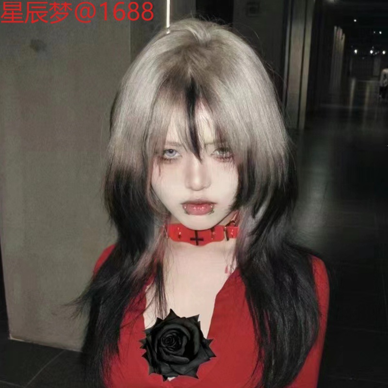 男性用ウィッグ、ロングヘア、オオカミの尻尾、女性用トレンディなヘアスタイル、黒と白のグラデーション、ボラヘッドシミュレーション、デイリー全頭カバー