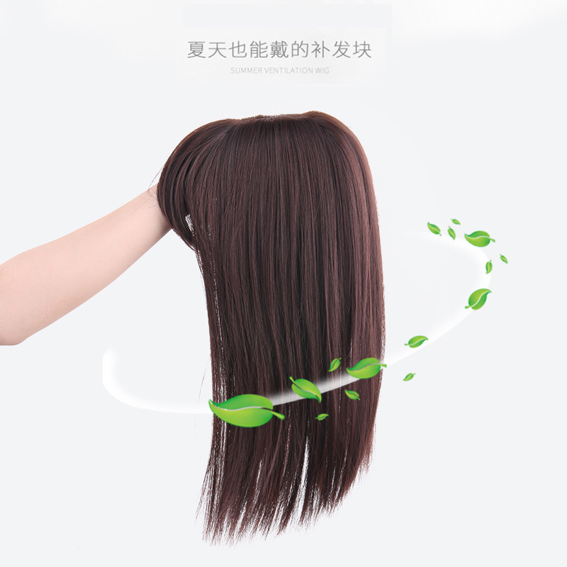 擬似髪の頭の上で髪を直します。空気前髪のかつらは白髪を隠します。