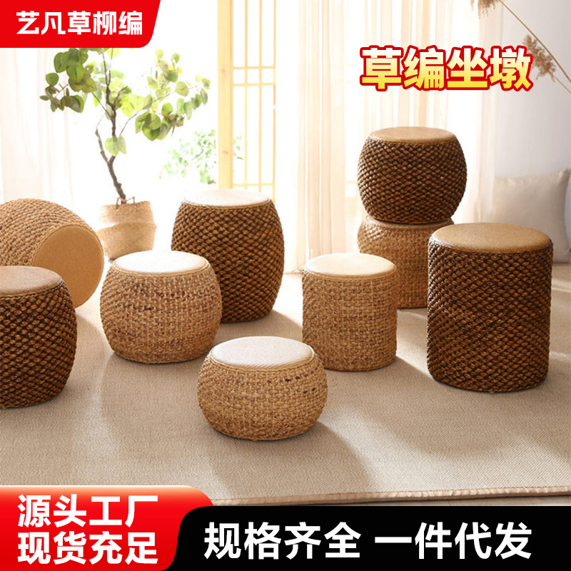 籐製の低いスツール、クリエイティブなラウンドスツール、手作りのわら編みのソファ、コーヒーテーブルスツール、ホームリビングルーム、ベッドルーム、無垢材のベンチ
