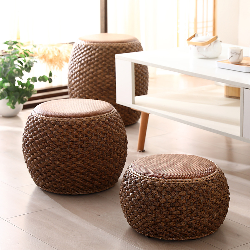 装飾的な家庭用手織り籐スツール、丸いスツール、丸いテーブル、低いスツール、ティースツール、コーヒーテーブルスツール、フットスツール、寝室用スツール、さまざまなスタイル