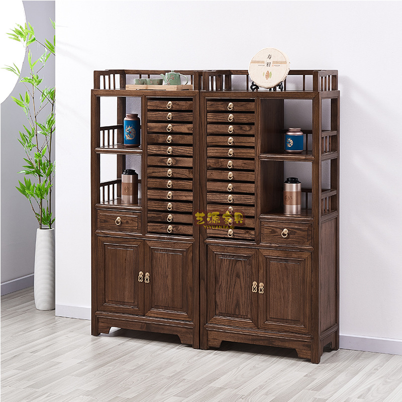 ウォールナット色のニレ茶ケーキキャビネット茶収納キャビネットプーアル茶キャビネット無垢材多層茶収納キャビネット