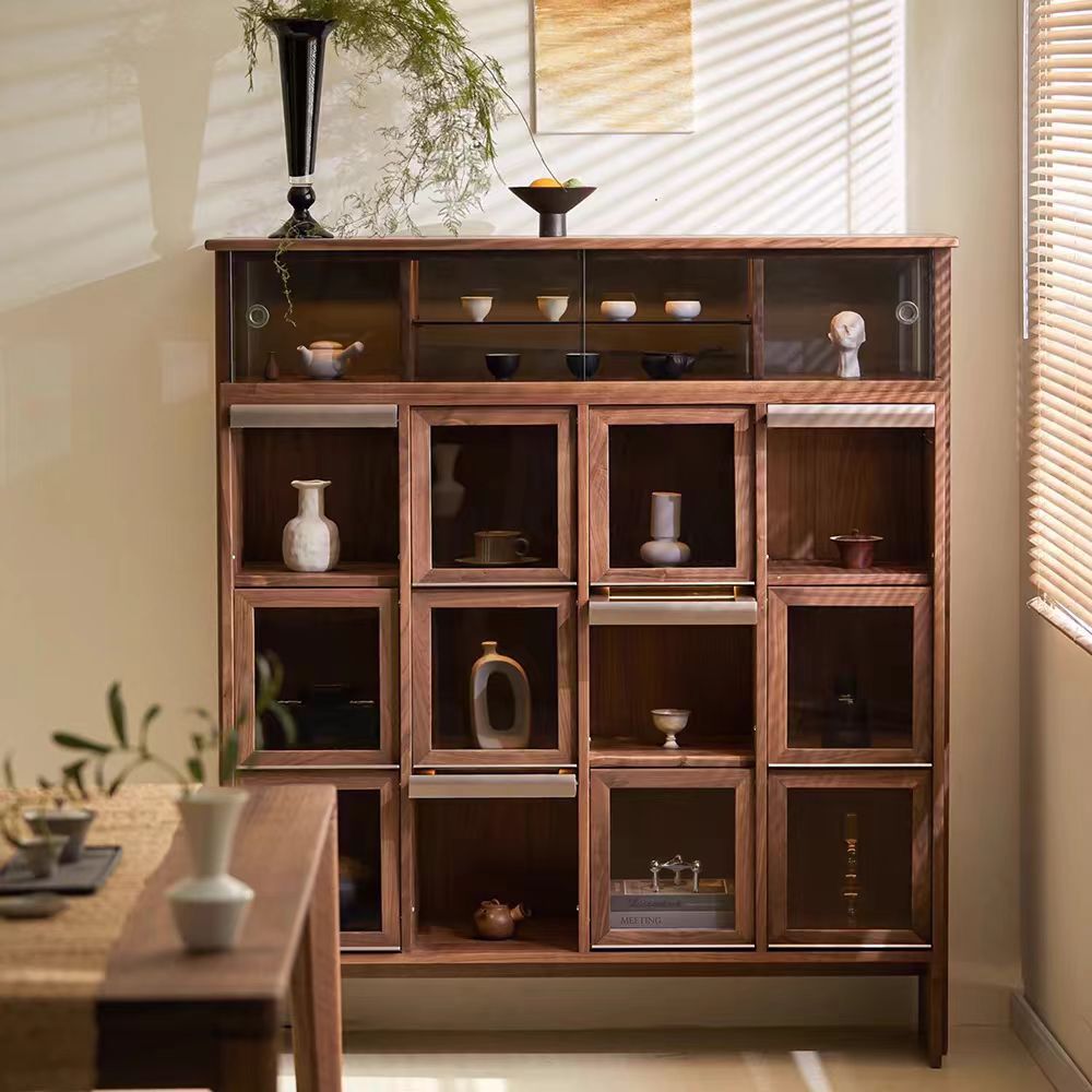 新中国式実木茶棚展示棚家庭用ショーケース黒胡桃木酒棚客間茶室収納棚