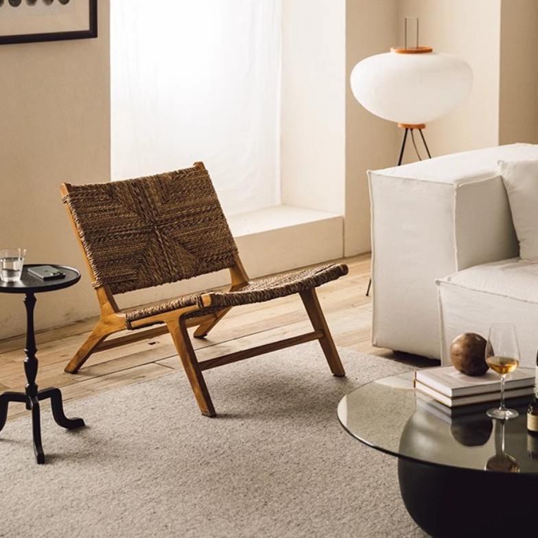 わびさび風無垢材レジャーチェアリビングルーム籐リクライニングチェアフットレスト組み合わせデザイナービュッフェアッシュソファチェア