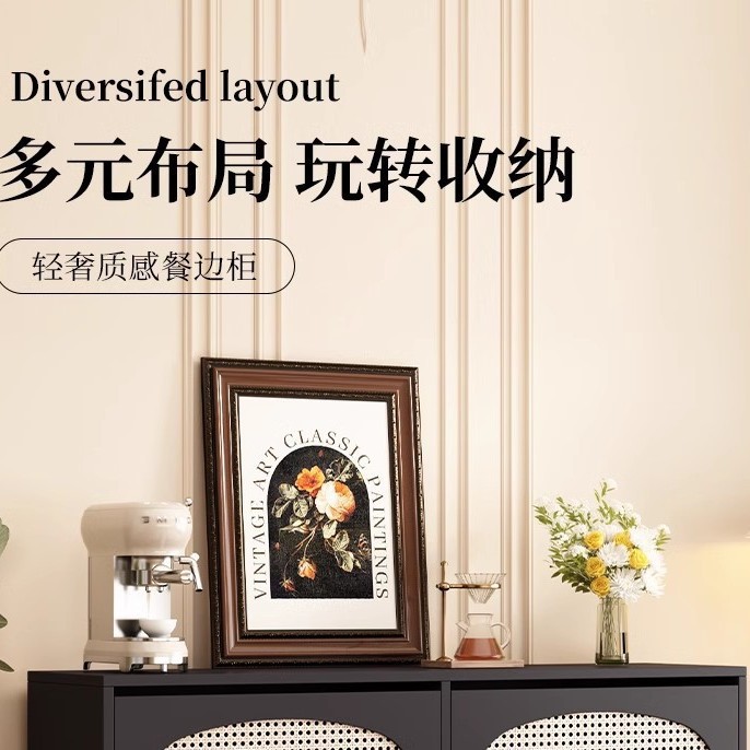 レトロな籐のキャビネットとサイドボード一体型フレンチリビングルームとダイニングルームの壁に取り付けられた多機能収納キャビネット