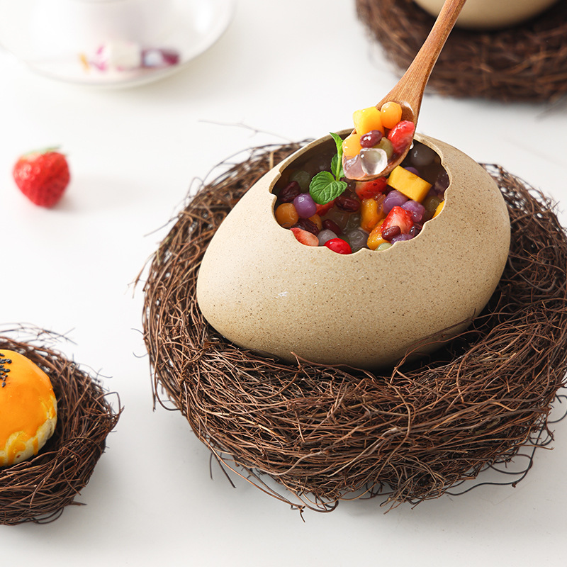 創意的な鳥の巣の甘いものの装飾品の卵の殻のダチョウの卵の形の陶磁器の碗の冷たい飲み物のバーベキューレストランは食器を食べます。