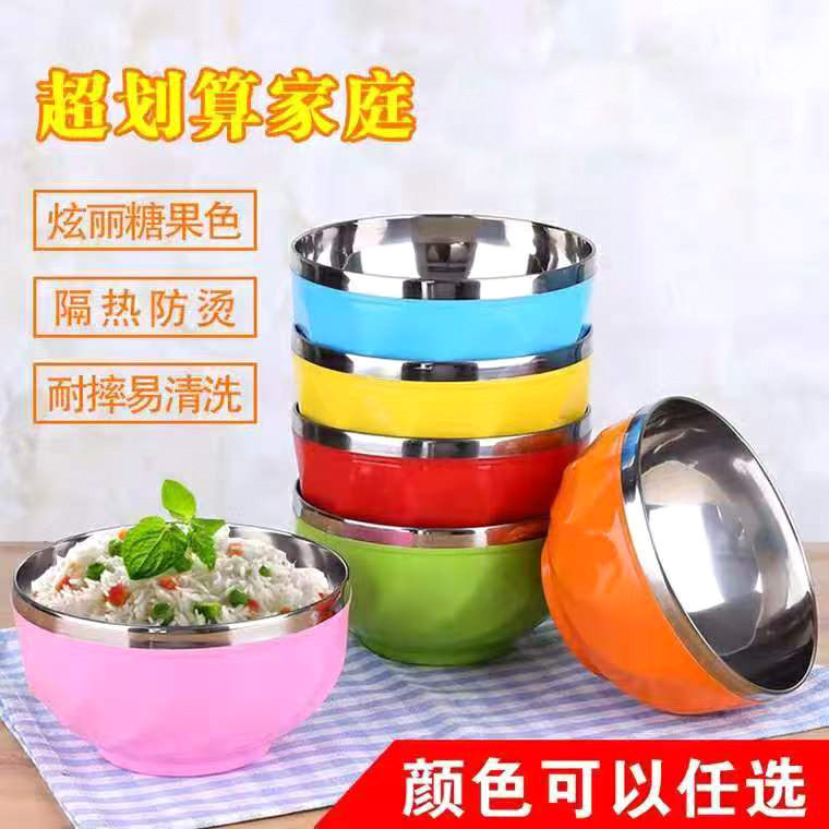 カラー二層ステンレス碗創意麺碗スープ碗子供食事断熱茶碗家庭用百合碗五色碗