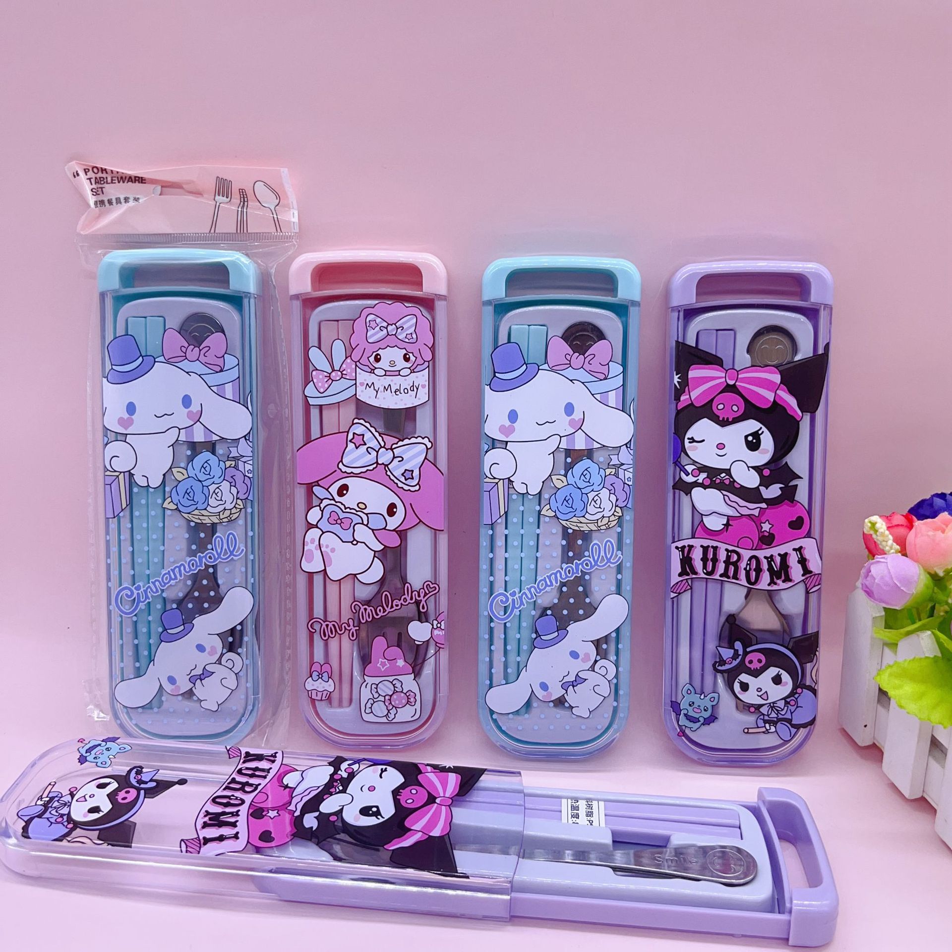 クリエイティブアニメは縦型の携帯食器を引き出してかわいい学生ステンレススプーンフォーク箸セットを収納する
