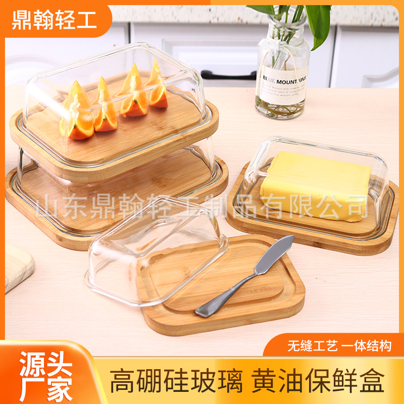 長方形高ホウケイ酸ガラスバターケース竹木蓋耐熱ガラス保冷ケース冷蔵ガラス弁当箱
