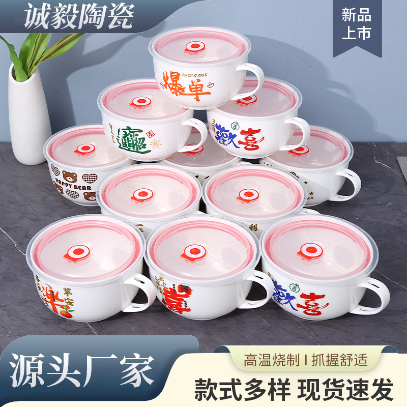 蓋付きインスタントラーメンボウル 6inch 電子レンジ中国風丸型片耳ハンドルギフト大型セラミックインスタントラーメンカップハンドル付き