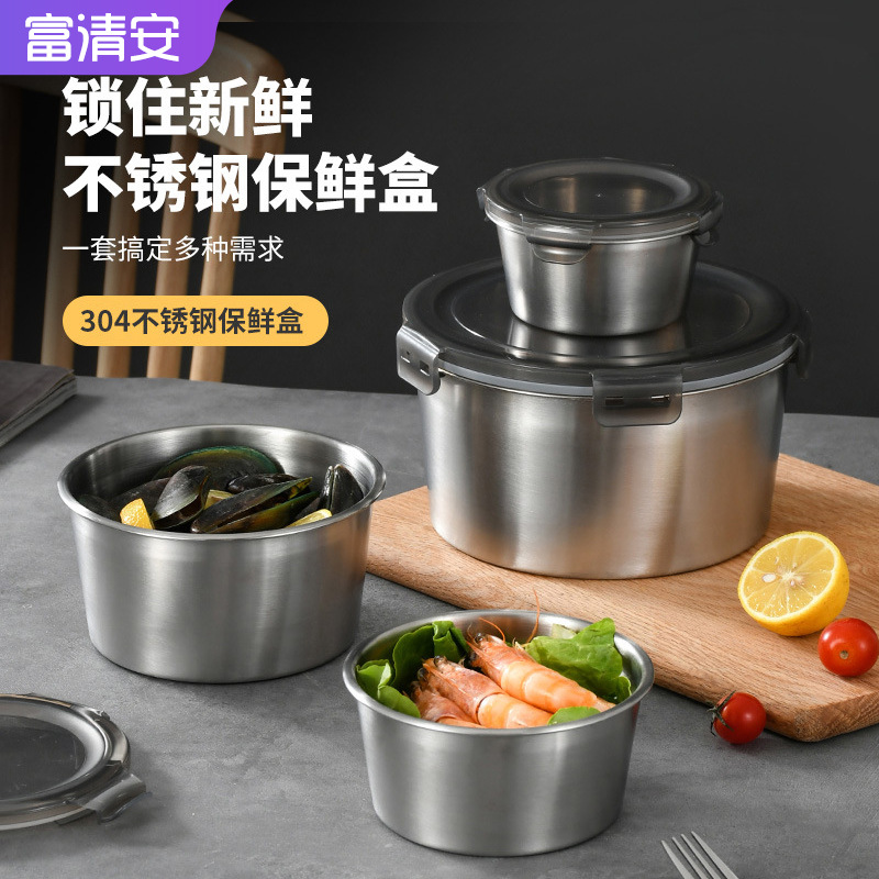 クロスボーダーステンレス丸型蓋付き鮮度保持ボックスセット5点セット鮮度保持ボウル密封缶保存缶テイクアウト弁当箱