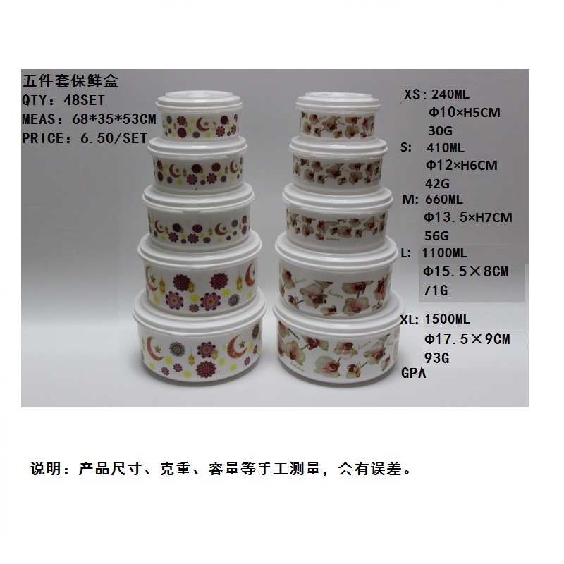 外国貿易の製品の5つのセットの円形の新鮮な箱の白いプラスチックの丸い缶の5セットのプリントの貯蔵箱