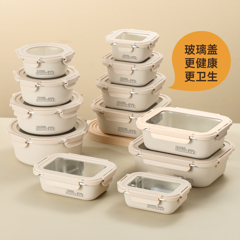 Xingbaifa 工場から直接供給される 304 ステンレス鋼のガラス蓋鮮度保持ボックスこぼれ防止密封弁当箱マルチ仕様のビジュアル蓋