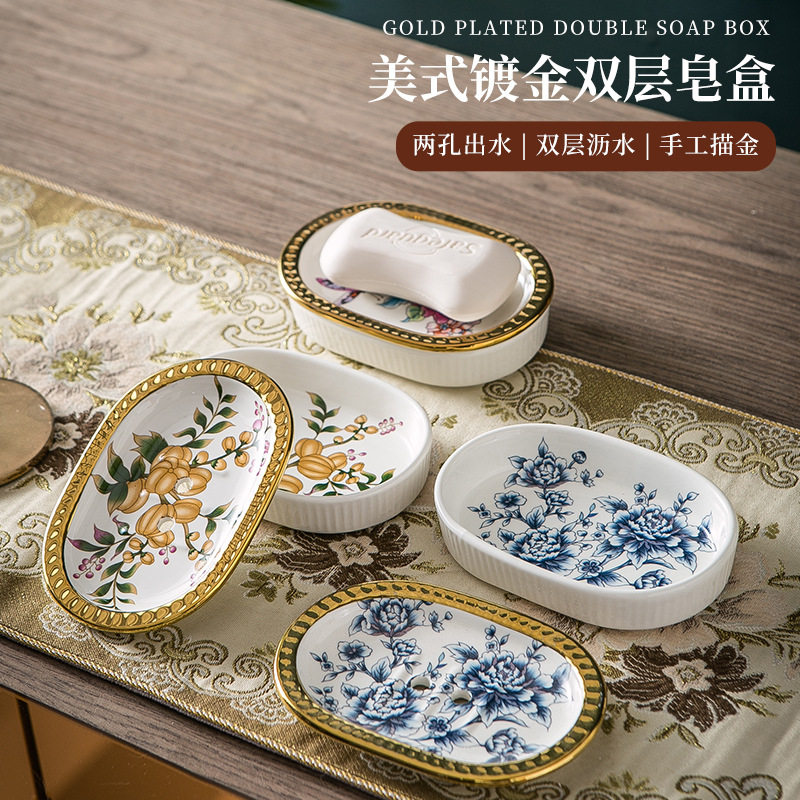 ヨーロピアンスタイルのライト高級セラミックソープボックス二層排水ボックスバスルームソープボックスアメリカンゴールドエッジソープディッシュは水が溜まりません