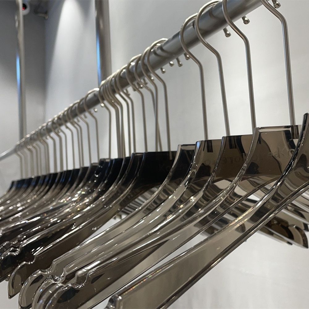タバコと灰色のハンガーと洋服の店の専用の服は婦人服の透明なズボンを掛けて滑り止めの水晶の服を挟んで支えます。