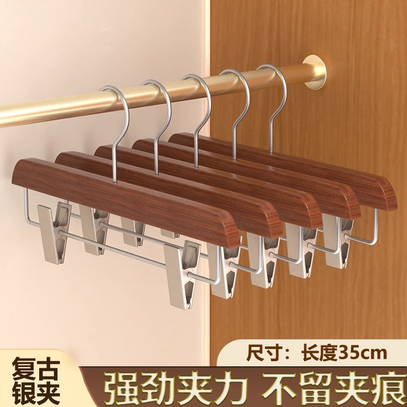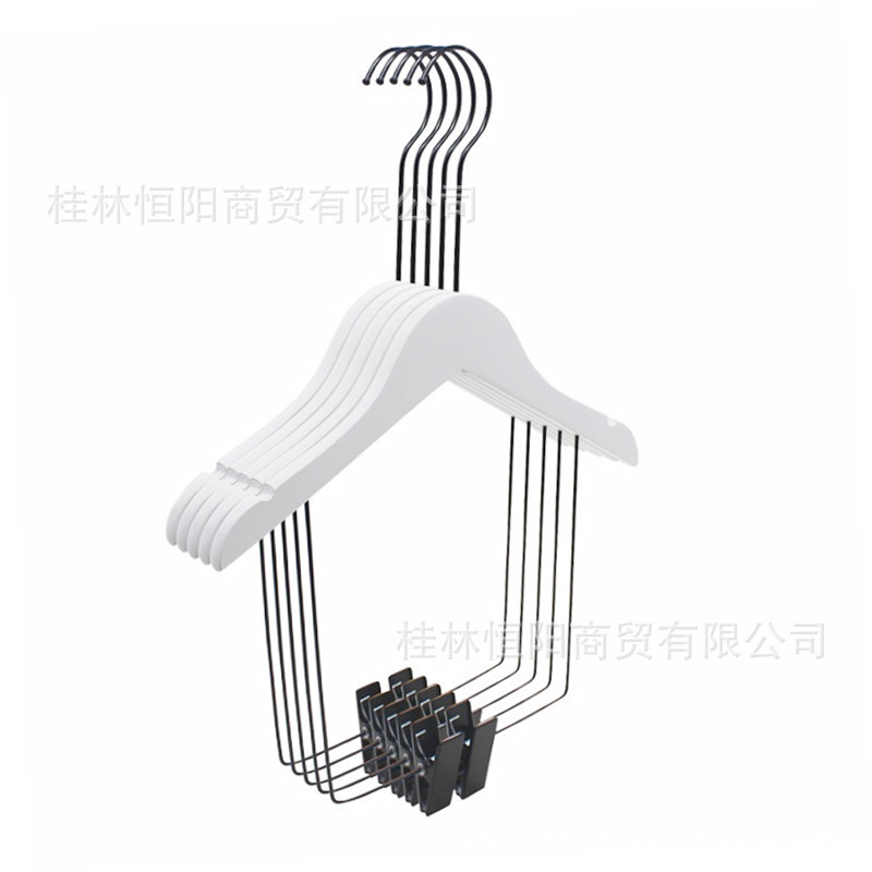 洋服店の母子店のハンガーの実木のズボンは黒い服を挟んでズボンを支えます。
