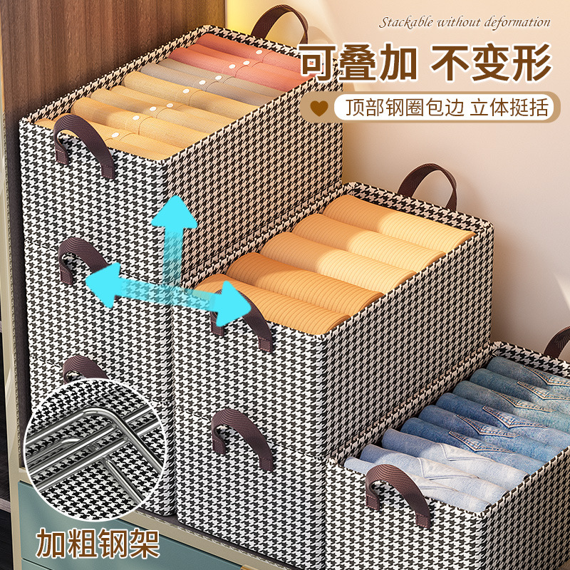 新しい服収納ボックス大容量家庭用整理ボックス引き出し式布芸収納ボックス千鳥格鋼フレームバスケット