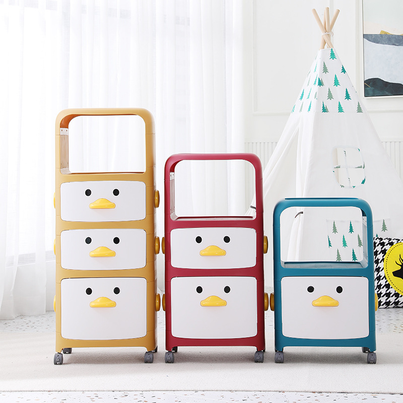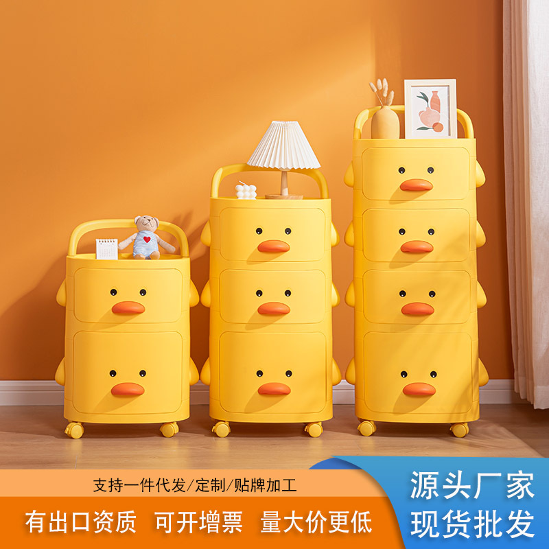 小さなカートの棚の小さな黄色のアヒルのスナックのロッカーの多層の子供の寝室のベッドのおもちゃの収納棚は移動できます。