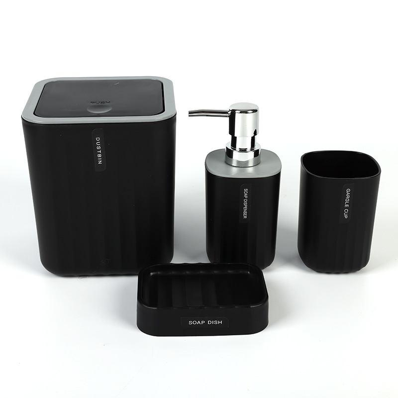 波紋模様のバスルーム洗面用具セット、卓上ゴミ箱、石鹸皿、うがいコップ、化粧水ボトルの4点セット