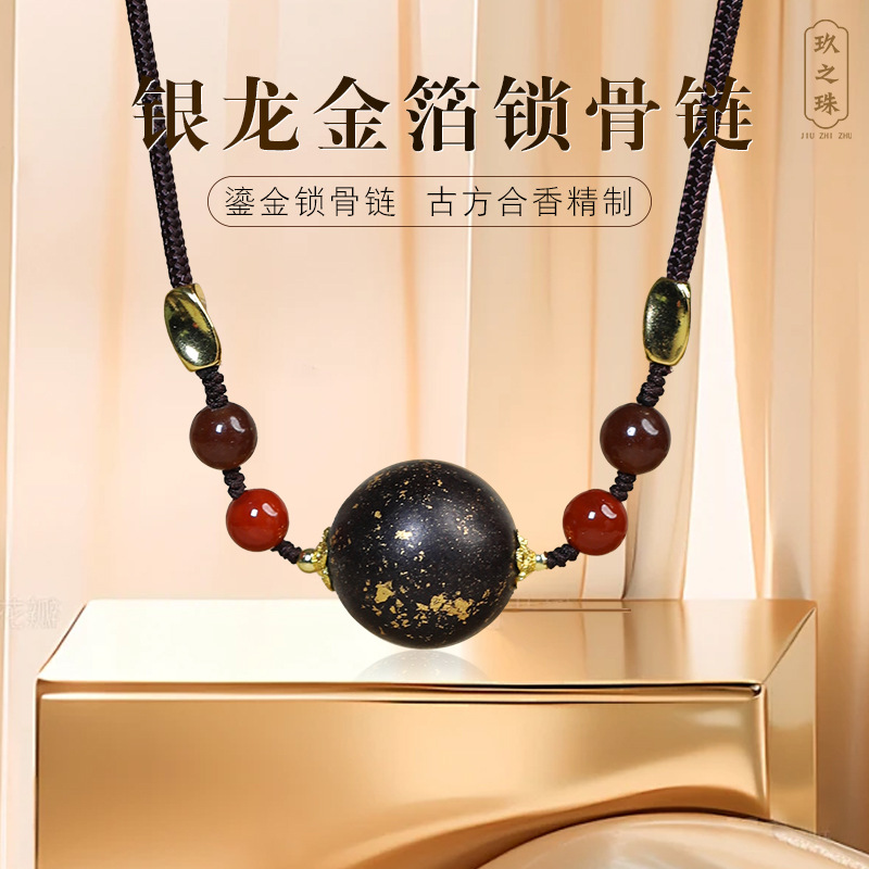 【銀龍金箔鎖骨チェーン】香珠黒龍唾金箔鎖骨ペンダント