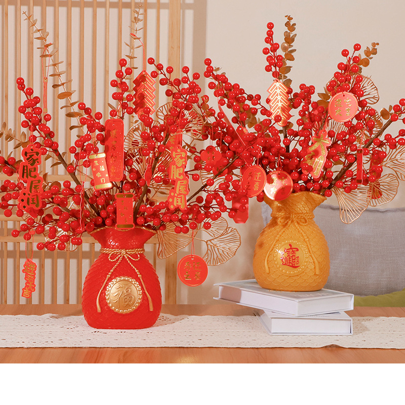 福袋の置物は金の実の赤い果物のお金の袋を飾って金の冬の青を招いてシミュレーションします。