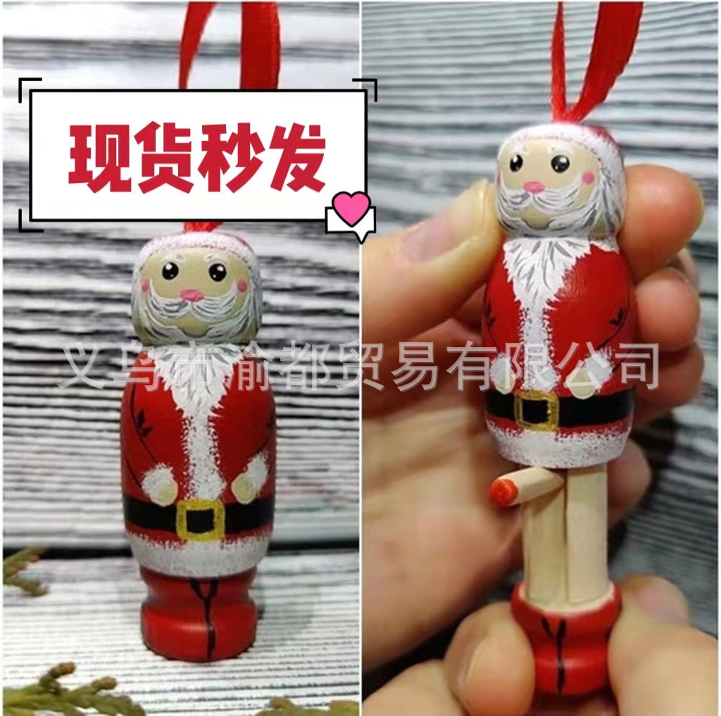 たくさんのスポットファンニーサンタの面白いサンタクロースがクリスマスツリーの木製趣味工芸品を飾っている