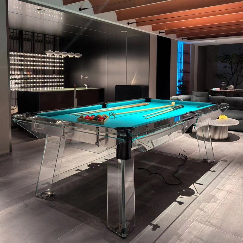 ライトクリスタル強化ガラスビリヤードテーブル中国テーブルアメリカンブラックエイトアクリルビリヤードテーブル