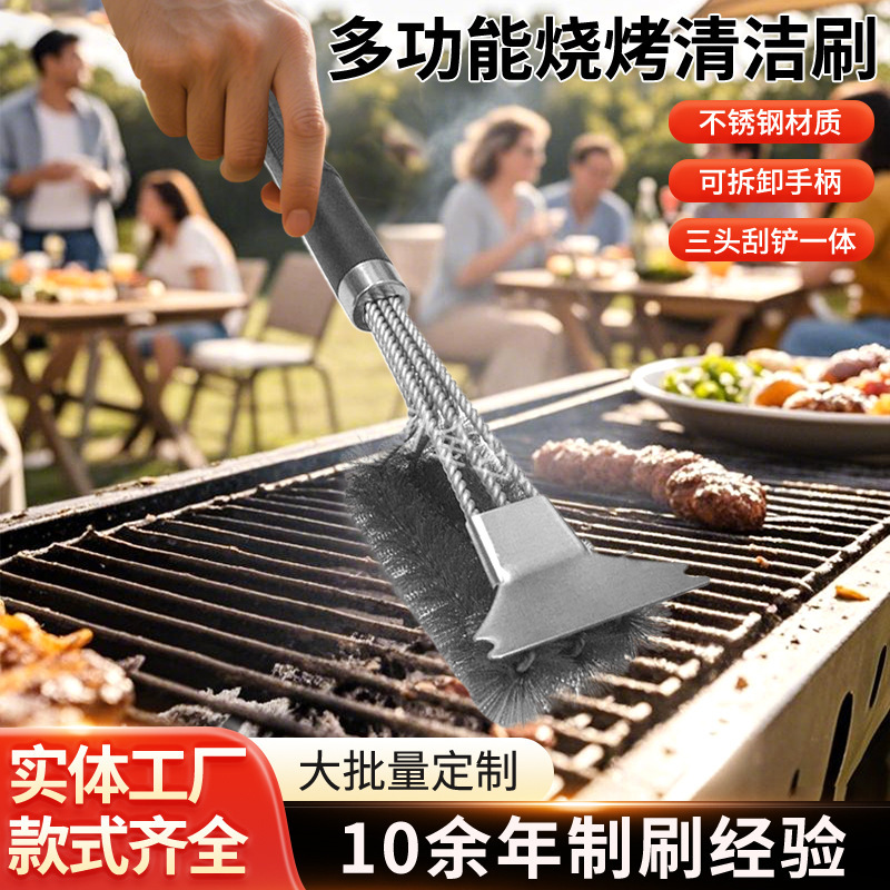 メーカー卸売 三頭ステンレス製バーベキューブラシ グリルオーブン バーベキュー掃除ブラシ スチールブラシ BBQバーベキュー道具