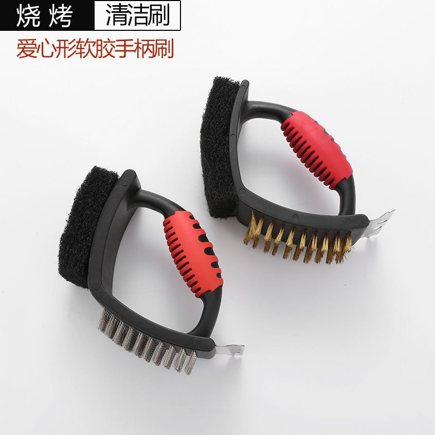バーベキューバーベキュー銅線ブラシ家庭用バーベキュークリーニングブラシスリーインワンスクレーパースチールブラシハート型ゴムコーティングされたバーベキュークリーニングブラシ
