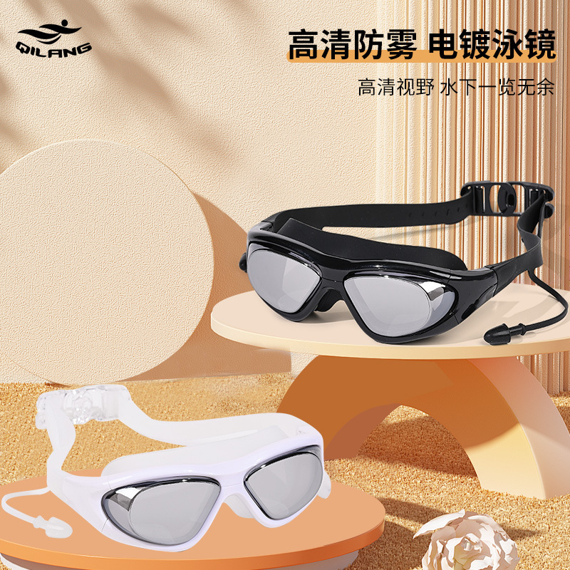 国境を越えて人気の高い大型フレーム水泳ゴーグル、高画質、防水、防曇、男女兼用、大人用、一体型耳栓付き、電気メッキ水泳ゴーグル