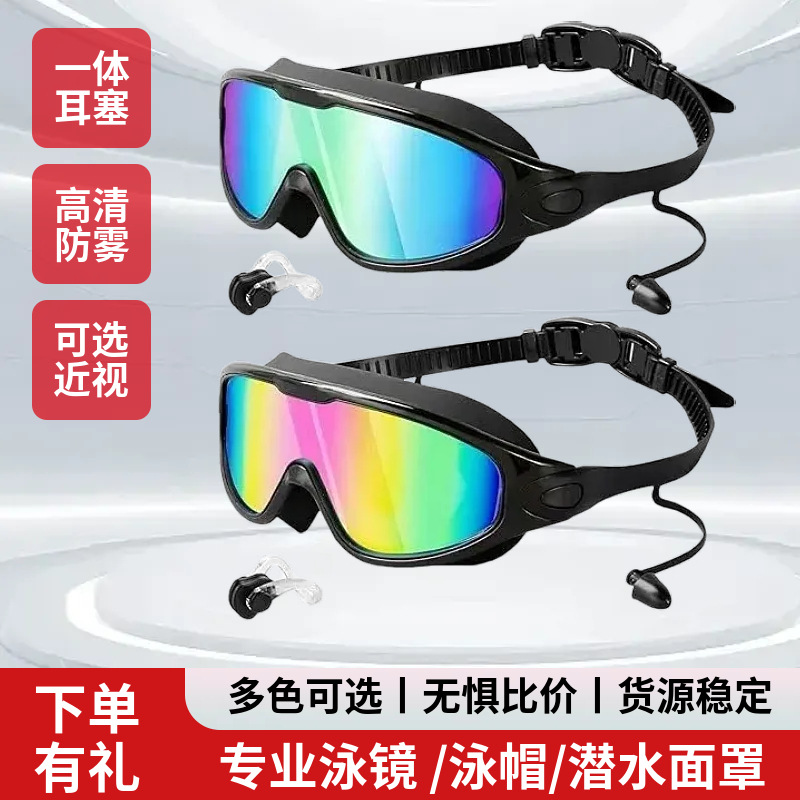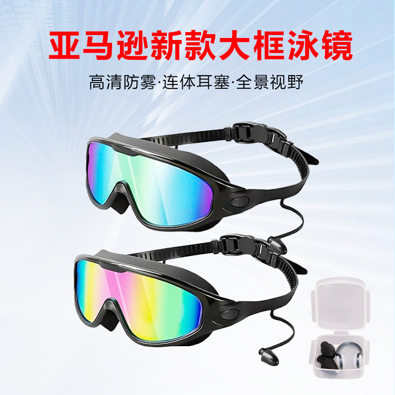 Amazonの人気の大型フレームスイミングゴーグル、高精細防水防曇プロフェッショナル男性と女性の大人用ワンピース耳栓電気メッキスイミングゴーグル