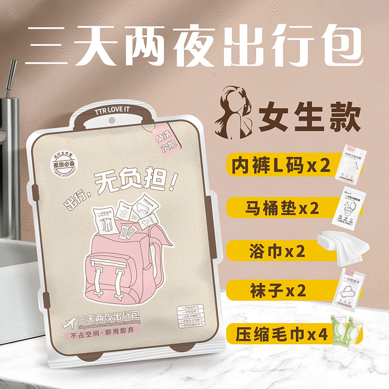 女性用2泊3日旅行バッグ、アウトドア使い捨て用品セット、トイレマット、ボートソックス、バスタオル、圧縮タオル、下着