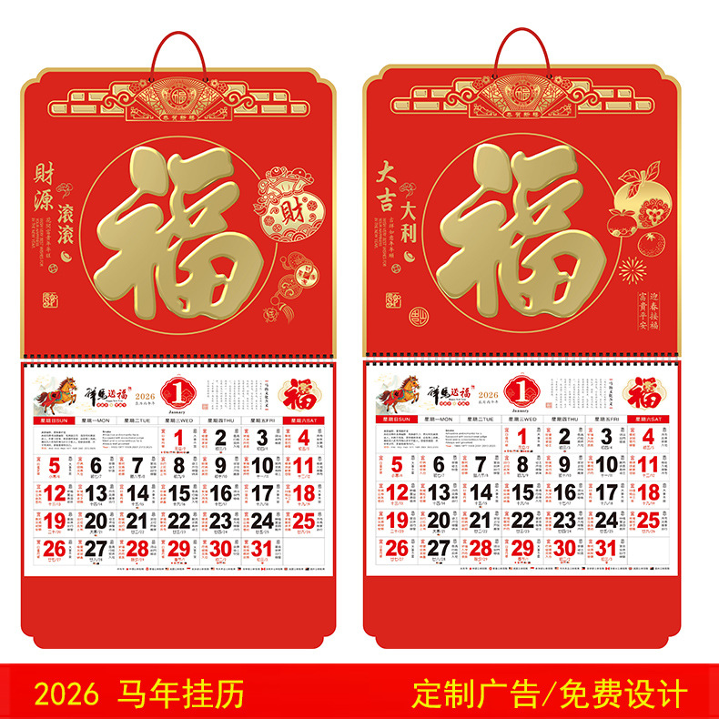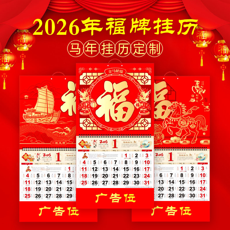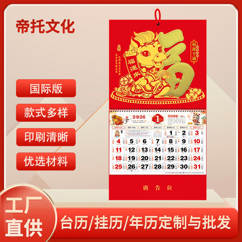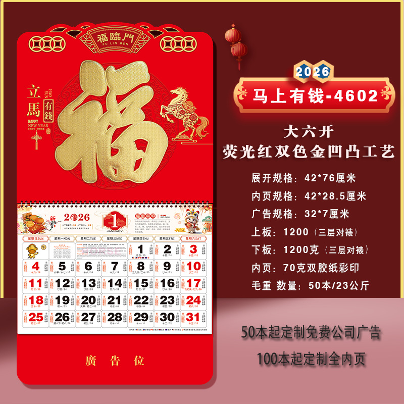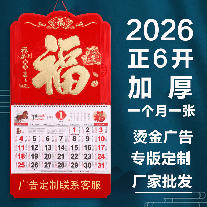 2026年馬年壁掛けカレンダー、正六開き、厚手金箔「福」字特別版、広告カスタマイズ、箔押し加工、工場直販卸売