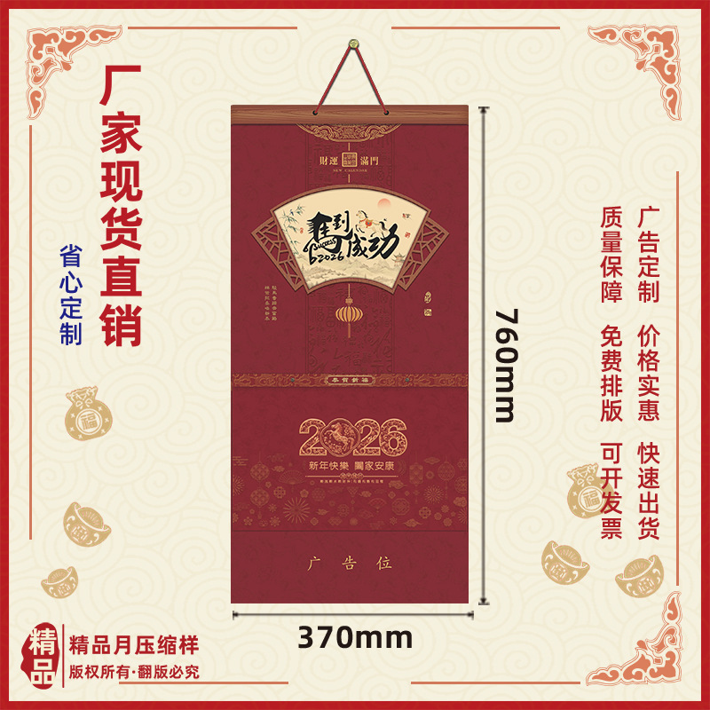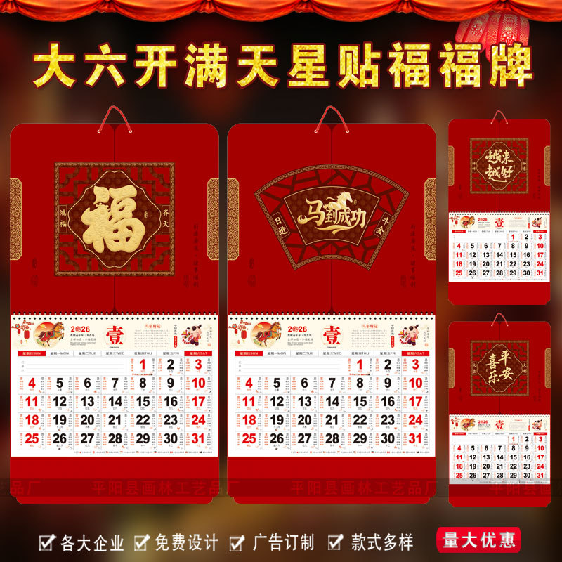 2026年馬年大六開蛍光赤浮彫り金箔福字吊り下げカレンダー年間カレンダー月間カレンダー企業ロゴ壁掛けカレンダー