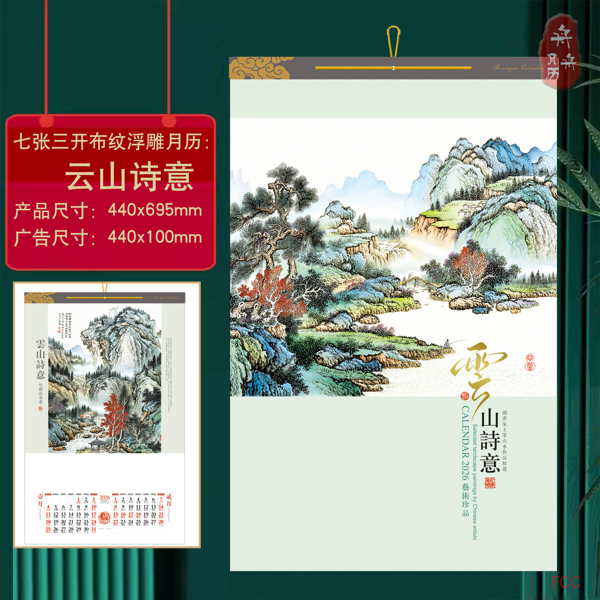 月間カレンダー7枚布地エンボス加工壁掛けカレンダー2026年新作伝統的な中国風カレンダー会社企業広告