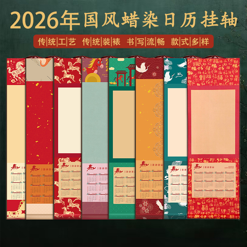 新作バティック2026年掛け軸カレンダー 中国風クリエイティブカレンダー巻物 手書き空白書道フレンチスタイル馬年画軸