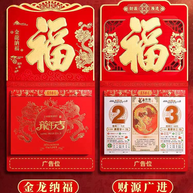 2024龍年正六開福字カレンダー吊り札カスタムレリーフ台カレンダー企業広告箔押しスポット