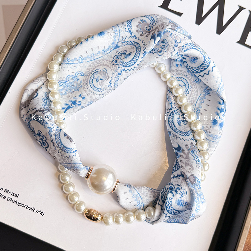 新しいスタイルの女性用ネックプロテクターパール小さなシルクスカーフツーピースセット夏の長い磁気バックル装飾ペンダントスカーフシンプルで多用途なスカーフ