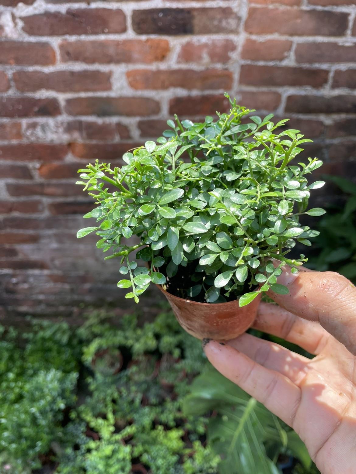 小葉九里香の形をした根付きの古い植木鉢の植え、手持ちのマイクロ盆栽、ミニの小さな緑の植物