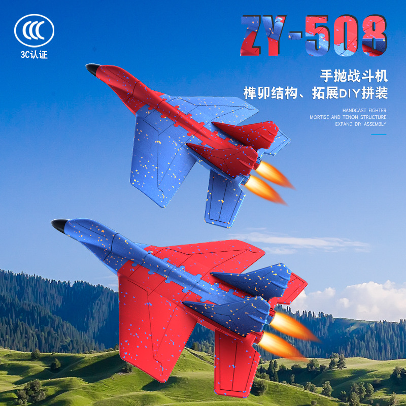 志揚のおもちゃの手は飛行機の戦闘機を投げます。