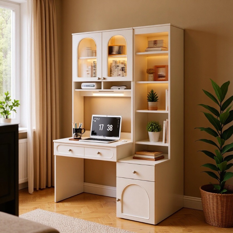 クリームスタイル無垢材多機能本棚床置き壁学習テーブルコーナーデスクホームベッドルーム一体型ライティングデスク