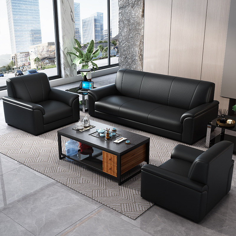 オフィスソファとコーヒーテーブルの組み合わせ シンプルなビジネスレセプションエリア レセプションティーテーブル オールインワン レザーアート 3人掛け ブラック