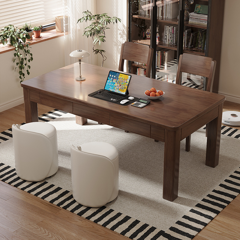 客間の実木の長い机は引き出し付きの家庭用テーブルと二人の学習テーブルがシンプルな机と食卓が一体になっている