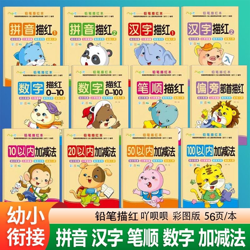 幼児向けの接続鉛筆で赤い漢字、数字、ピンイン、筆画、部首を描き、100以内の足し算と引き算を子供たちが練習できる本