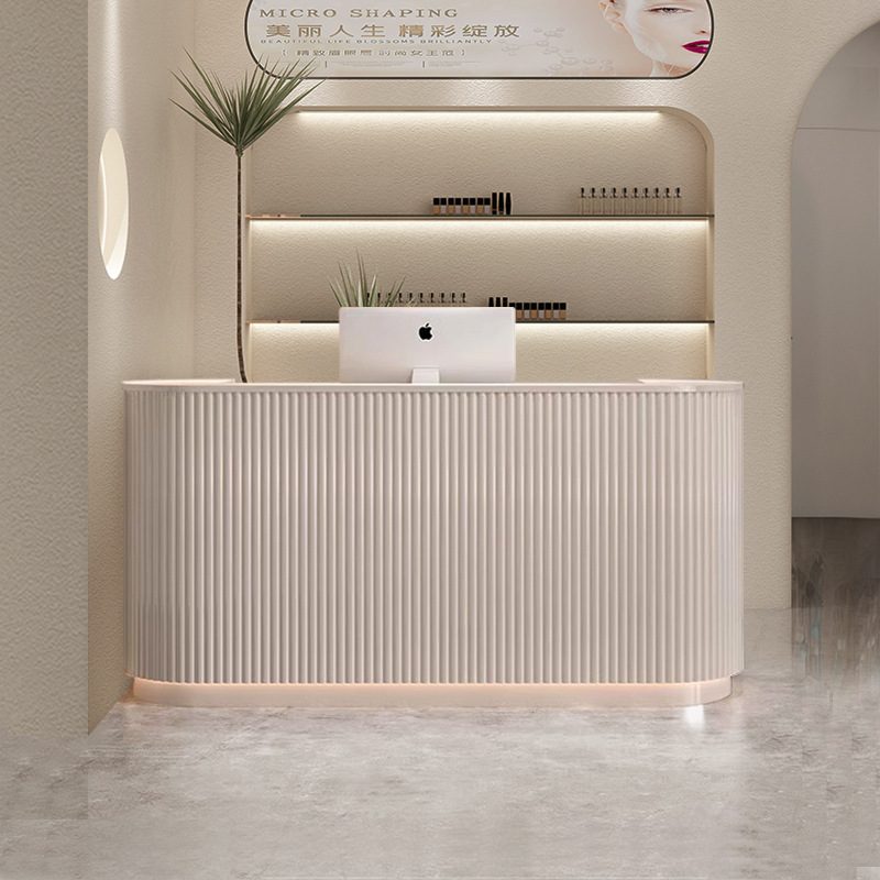 シンプルでモダンな曲線状のバーカウンター、塗装された受付カウンター、会社の受付、美容室のカウンター、白いレジカウンター