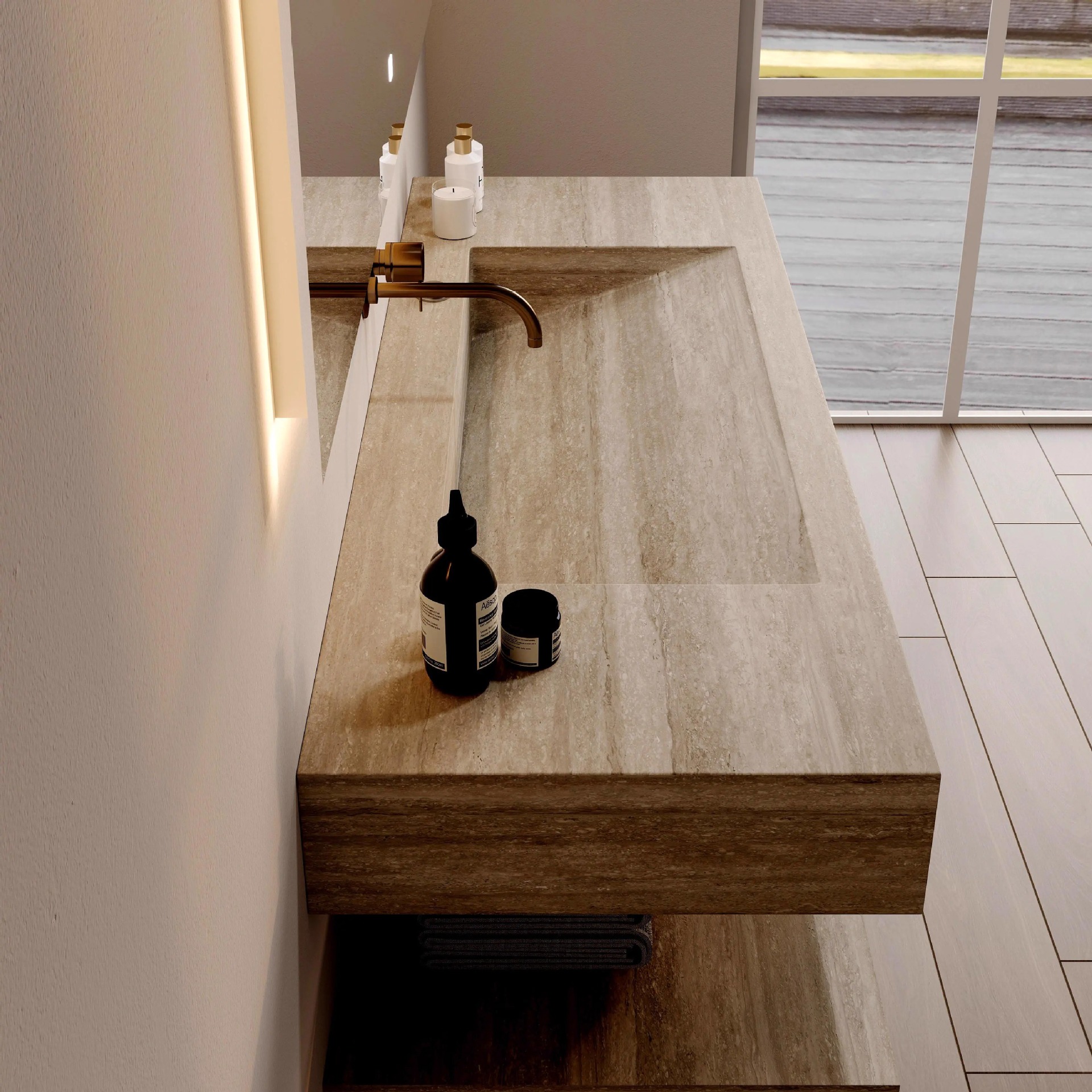 カスタマイズされたスレート一体型シームレス洗面台バスルームキャビネット組み合わせトラバーチン洗面台ホテルダブル洗面台